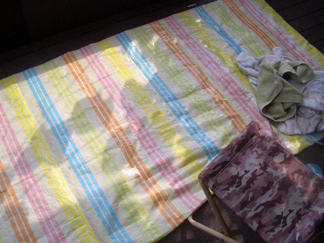 ビッグサイズのピクニックシートを床に敷き、おデブをその上に乗せます。