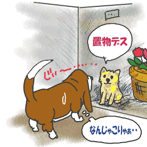 ゴン太は置物はすぐ見抜きます。千歳にあるアウトレットモールにハッシュパピーのお店がありそこの置物で一度同じ様な事をしてから学習したのか、それからは置物には興味を示さなくなりました。エルビー君もそのうち興味を示さなくなると思います。