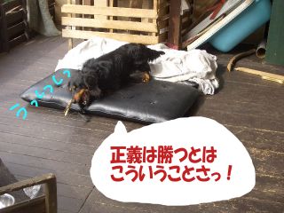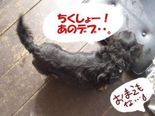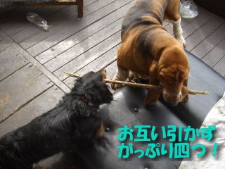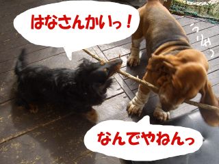 このバトル、見るも楽しですけど・・・かなりヒートアップすると、デブ犬の方がマジ切れして、ボスコが死にそうな悲鳴をあげるケースに発展する事度々です。(・ω・;)(;・ω・)
