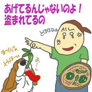 ピーマン、しし唐も生でイケルんですね~ワンコたち。それも食べごろに勝手に庭で調達できるなんて、幸せなワンズですこと。