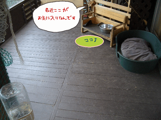 最近なぜか・・・朝ここでオシッコをしてくれるエルビー。 こ"らっ!!!Σ(゜ Д ゜ #) なぜだ?突然!なんのブームだ?! それをここ3回ほど拭かせて頂いたのだけど、やはりハラが立つので 朝、犬どもがおしっこをする場面を見張ってやろうと、 デッキに出て待ち構えておりました。